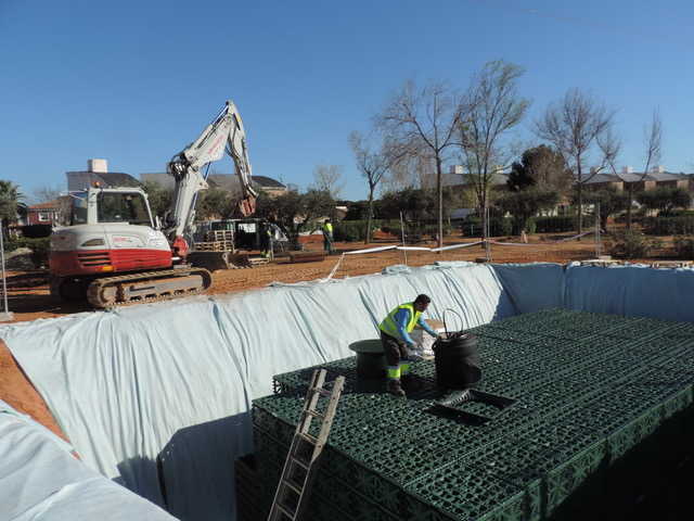 El dipòsit d’infiltració, que ha instal·lat sota terra l’empresa Graf Ibèrica, és una estructura de caixes de plàstic reciclat i reciclable col.locades una dins de l’altra, que recullen l’aigua que es filtra des de la superficie evitant enbassaments i inundacions en zones verdes i carrers.