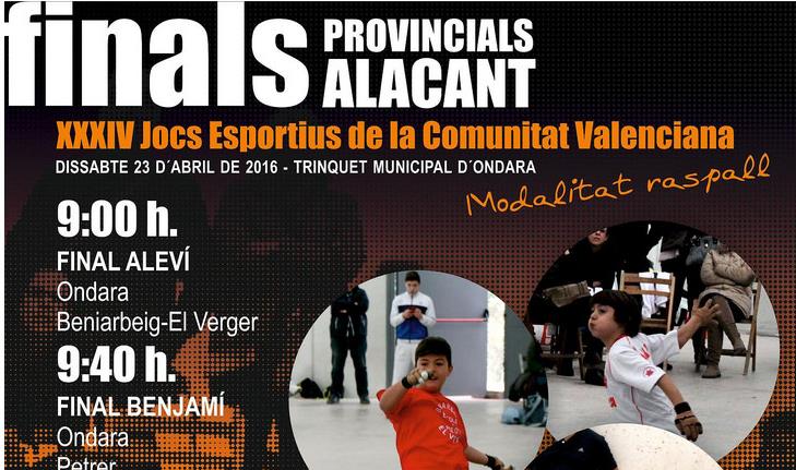 El Trinquet Municipal d’Ondara acollirà per primera vegada unes finals provincials dels Jocs Esportius de la Comunitat Valenciana, modalitat raspall. Aquest dissabte 23 d’abril, a partir de les 9 hores, es disputaran en aquesta instal·lació esportiva d’Ondara les finals de categoria benjamí, aleví, cadet, infantil i juvenil, amb la participació dels equips millor classificats de la província d’Alacant, entre ells, tres equips de l’Escola Municipal de Piota d’Ondara (benjamí, aleví i infantil).