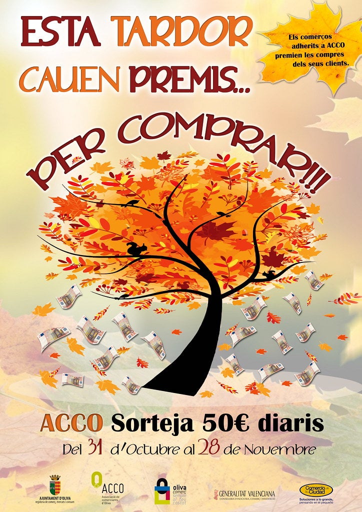 Davall l’eslògan “Esta tardor cauen….. premis per comprar”, pretenem animar les compres en este període enviant un missatge positiu i alegre. Es van sortejar 50,00 € al dia en vals de compra (Eur-ACCOs) entre tots els clients que van comprar en els comerços associats.