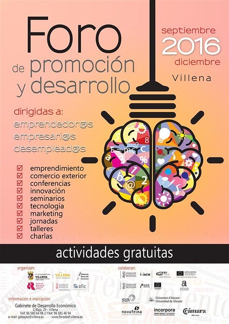 La programació completa d’activitats pot consultar-se a través a través de la web http://www.forodeef.villena.es/ on hauran d’inscriure’s en les activitats que desitgen realitzar. Les inscripcions podran realitzar-se personalment en el Gabinet de Desenvolupament Econòmic en el carrer Baix, 29, en el telèfon 96 580 64 98 o a través del correu electrònic gdayto@villena.es