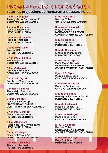 Respecte als barris que es projectaran seran el Roís de Corella (Passeig Germanies 91), Marxuquera (Ermita de Marxuquera), Grau (Parc de l’Oller), Santa Anna (plaça de Santa Anna), Corea – Jardinet (plaça del Jardinet), Raval (plaça de Sant Josep), Plaça El·líptica – Rep. Argentina (Plaça El·líptica), Centre Històric (Plaça Escola Pia), Beniopa (Plaça Major) i Benipeixcar (plaça de Benipeixcar). Totes les pel·lícules començaran a les 22 h.