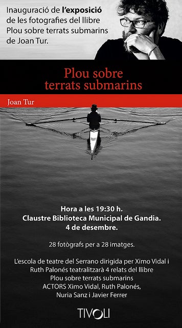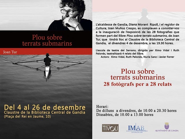 Plou sobre terrats submarins de l’autor Joan Tur. La mostra s’inaugurarà el pròxim 4 de desembre a les 19:30 en el claustre de la biblioteca municipal de Gandia. L’acte comptarà amb la presentació del grup de teatre del Serrano dirigit per Ximo Vidal i Ruth Palonés que juntament amb Nuria Sanz i Javier Ferrer interpretaran 4 dels relats del llibre del que s’acaba d’editar la segona edició. L’acte estarà conduït per la periodista Susana Calafat.