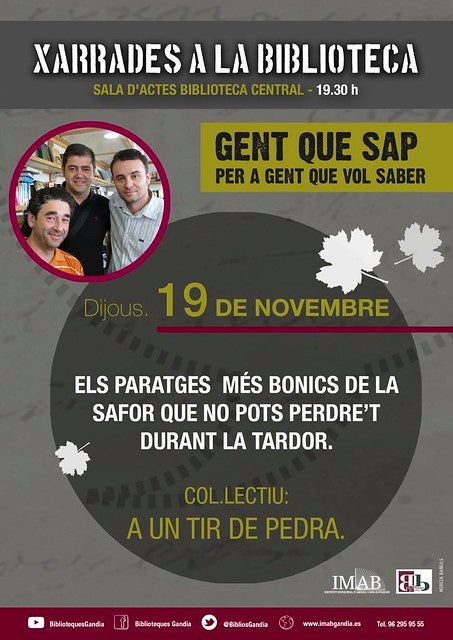 La segona sessió tindrà lloc el dijous 19 de novembre a les 19:30 h. a la Sala d’Actes de la Bibioteca Central i tractarà sobre “els paratges més bonics de La Safor que no pots perdre’t durant la tardor”.