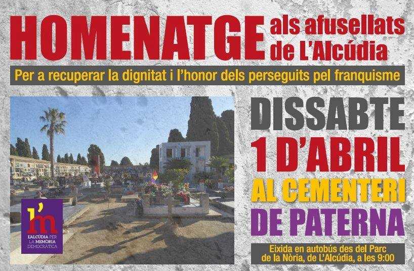 Recordeu que l’associació “L’Alcúdia per la Memòria Democràtica” ha organitzat aquest dissabte, 1 d’abril, una visita al cementeri de Paterna per tal de retre homenatge a les víctimes de la repressió de l’Alcúdia.