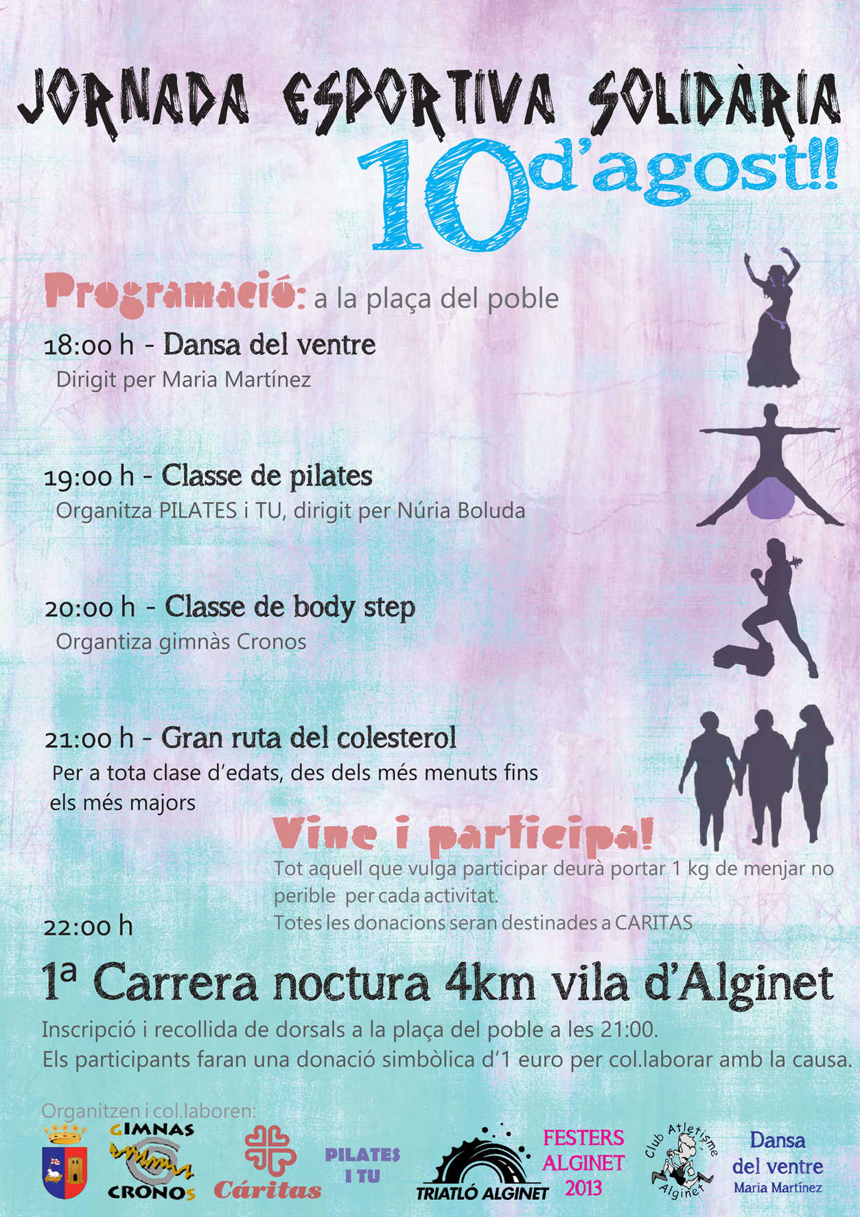 Els festers i festeres de 2013, junt amb l’Ajuntament d’Alginet, han preparat per al pròxim dissabte la I Jornada Esportiva Solidària. Esportiva perquè a partir de les 18 h, a la plaça de la Constitució, es farà una classe de dansa del ventre a càrrec de Maria Martínez, a les 19 h Núria Boluda impartirà una classe del mètode Pilates, a les 20 h el gimnàs Cronos farà una sessió de Body Step i a les 21 h menuts i majors caminaran la coneguda com a “ruta del colesterol” pel poble. Per tancar la vesprada esportiva solidària, a les 22 h es realitzarà la primera carrera nocturna Vila d’Alginet.