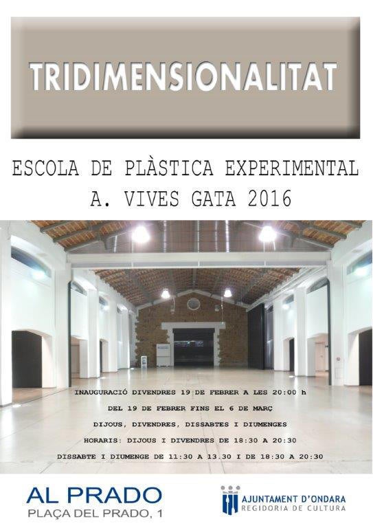 “Tridimensionalitat” prendrà El Prado com una plataforma per a l’exhibició d’art contemporani, que podrà ser visitada durant tres caps de setmana, del 19 de febrer al 6 de març. La mostra s’inaugurarà demà divendres 19 de febrer a les 20 hores. Es podrà visitar al Prado els dijous, divendres, dissabtes i diumenges de 18:30 a 20:30 hores, i els dissabtes i diumenges també en horari matutí, d’11:30 a 13:30 hores.
