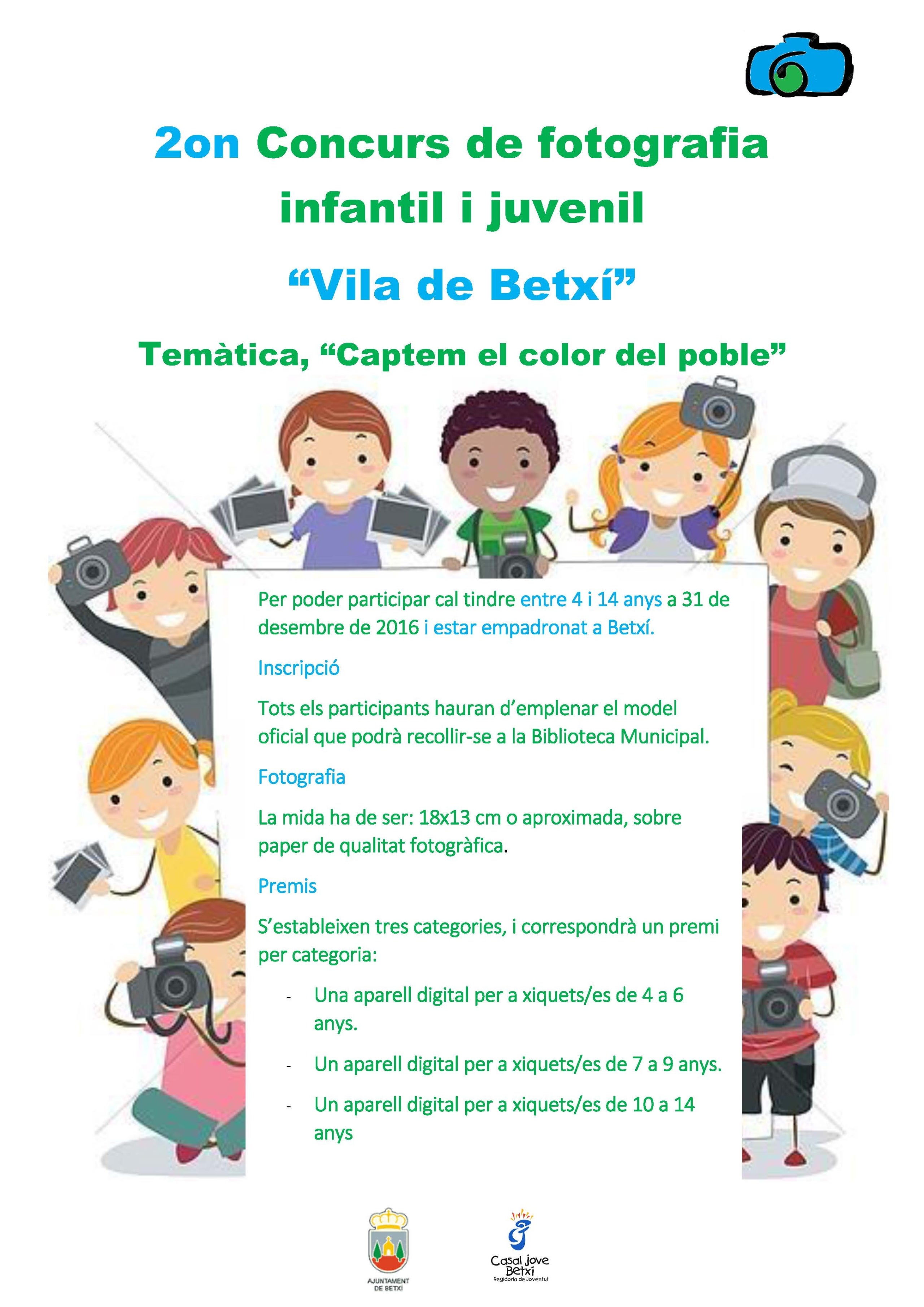 Per poder participar en el segon Concurs de Fotografia Infantil i Juvenil “Vila de Betxí” cal tindre entre 4 i 14 anys a 31 de desembre de 2016 i estar empadronat/da a Betxí.