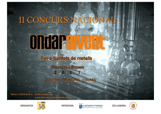 Ondara acollirà el diumenge 8 de gener l’II Concurs Nacional de Quintets de Metalls “Ondaralvent”, que se celebrarà en l’Auditori Municipal. Aquest certamen musical, de projecció nacional, està organitzat pel Quintet de Metalls Al Vent (QMAV) i per la Regidoria de Cultura de l’Ajuntament d’Ondara, amb la col·laboració de Consolat de Mar. El termini d’inscripció per als participants estarà obert fins al dia 1 de gener.