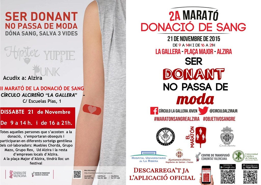 Des de l’Ajuntament d’Alzira, la Regidoria de Salut i la Regidoria de Festes han organitzar el II Marató de donació de sang, que farà d’este dia una especial jornada en la qual totes les veïnes i veïns podran participar, fent saber que Alzira és una ciutat solidaria, al mateix temps que disfrutaran d’una jornada de espectacles en la Plaça Major, amb artistes convidats que volen donar suport a esta gran acció, junt amb una sèrie d’activitats d’animació per als més menuts.