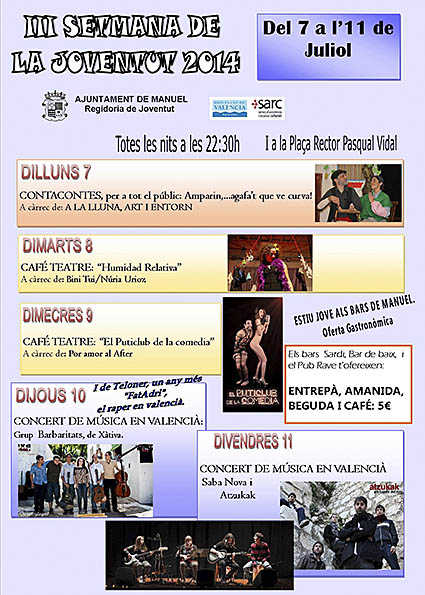 Per tercer any, des de les Regidories de Joventut i Educació organitzem la Setmana de la Joventut, amb actuacions teatrals i musicals al carrer: cafè-teatre, contacontes i música en valencià.