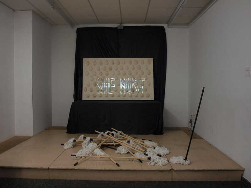 “She Must” reflecteix tot el que segueix passant a la nostra societat. A través de l’assimilació conceptual entre la dona estereotipada com “mestressa de casa” i el pal de fregar es conforma una crítica al masclisme a partir de la pròpia representació. En un to irònic, manifestat per tipografies tant lumíniques com cal·ligràfiques i amb l’ús d’objectes associats gairebé de forma exclusiva al gènere femení, es genera un efecte de mirall cap a l’espectador, fent visible la realitat. “La su-misión y reflejo”, en definitiva, constitueix la reivindicació de la igualtat entre gèneres i la fugida dels rols socials creats i impostos entre les dones i els homes.