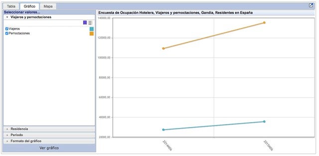 Al mateix temps, el nombre de pernoctacions a Gandia de residents a Espanya ha passat de les 109.318 persones de juny de 2014 a 135.339 en el mateix mes d’enguany, amb un increment de vora 26.000 persones. També s’ha produït un augment en el nombre de viatgers, passant dels 29.503 viatgers de 2014 als 37.796 en juny de 2015.