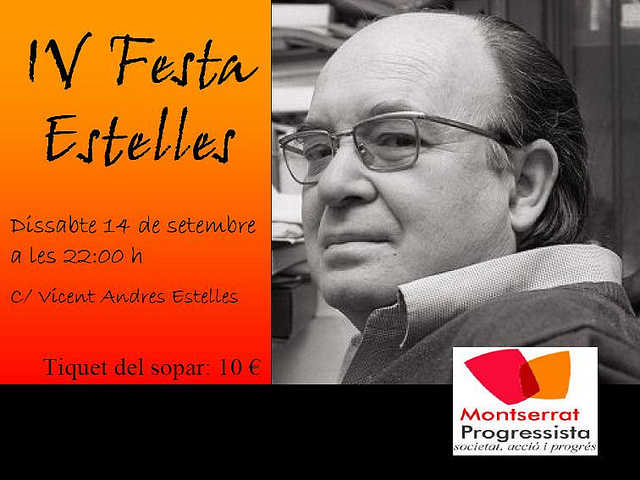 A Montserrat estem preparant ja la IV Festa Estellés, si tens gust de participar, pots adquirir el tiquet i vindre al sopar del dissabte 14 de setembre al Carrer Vicent Andrés Estellés, gaudiren de bona música i sobre tot de la poesia del Nostre Poeta.