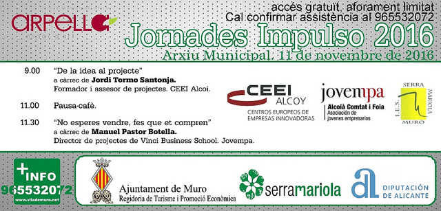 L’objectiu d’aquestes jornades es fomentar l’emprenedoria, està dirigit a tots els públics i l’entrada es gratuïta. Aquest any contarem amb la col·laboració del CEEI Alcoi amb la participació de Jordi Tormo Santonja, Formador i assessor de projectes, que ens oferirà el taller “De la idea al projecte” i amb la col·laboració de Jovempa Alcoià, Comtat i Foia, que ens ha facilitat la participació de Manuel Pastor Botella, Director de Projectes de Vinci Business School, amb el taller “No esperes vendre, fes que et compren”.