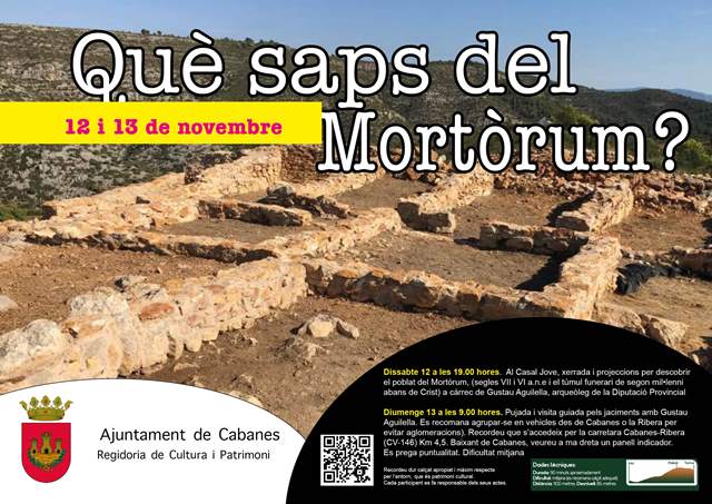 La primera activitat serà una xerrada a càrrec de l’arqueòleg de la Diputació, Gustau Aguilella, el qual du més d’una dècada al front dels treballs de recuperació d’aquest entorn. Aquesta xerrada didàctica tindrà lloc a partir de les 19:00 al Casal Jove.Es projectaran recreacions i imatges dels treballs arqueològics fet pels serveis de la Diputació, en els quals també ha col·laborat l’ajuntament ( per exemple aquest any finançant les actuacions per posar en valor el túmul funerari”:
