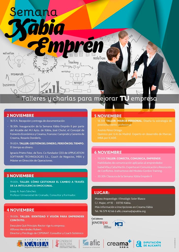 La tècnic del Creama Xàbia, Josette Russo, ha indicat que les jornades “Xàbia Emprén” compten amb la col•laboració de Jovempa i l’associació Dones Emprenedores de Xàbia, a més d’amb una subvenció de la Diputació d’Alacant de 6.000 euros.