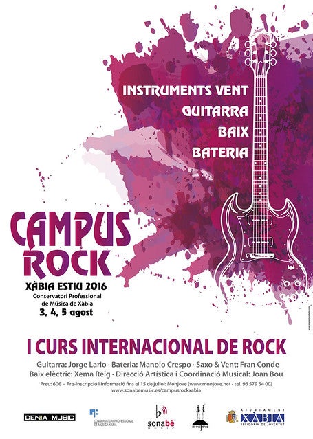 El regidor de Joventut de l’Ajuntament de Xàbia, Ximo Segarra, ha presentat una de les novetats que impulsa el seu departament de cara a aquest estiu: el primer campus rock. Es tracta d’un curs musical centrat en els instruments que solen estar presents en les bandes, com són la guitarra, el baix elèctric, la bateria i instruments de vent com el saxòfon, trombó o trompeta. El campus, que té professors com Jorge Lario, Manolo Crespo Fran Conde o Xema Reig, se celebrarà del 3 al 5 d’agost en el Conservatori Professional de Xàbia baix la direcció de Joan Bou i té un preu de 60 euros.