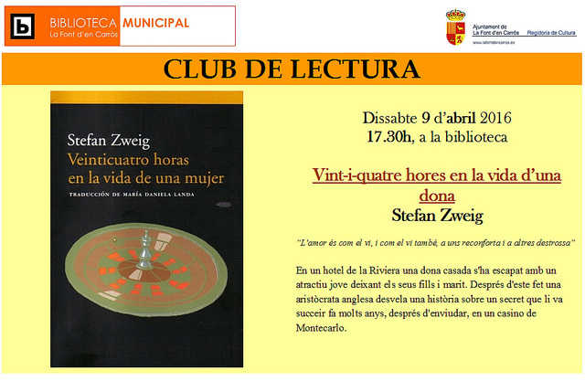 Dissabte 9 d’abril, 17.30h, en la biblioteca de la Font d’en Carròs, sessió del Club de lectura.