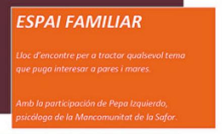 Dilluns 30 de maig, a les 15h, al CEIP Francesc Carròs, escoles de la Font d’en Carròs, ESPAI FAMILIAR. Espai de debat i participació de les famílies, dirigit a mares i pares d’alumnes de totes les edats.