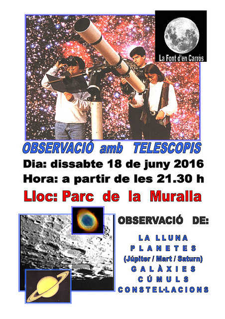 La setmana vinent, dissabte 18 de juny, 20h sopar, 21.30h taller de telescopi.