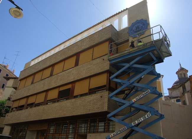 Les obres de la nova prefectura de Policia Local a la Plaça Major d’Ontinyent avancen a bon ritme, i estaran a punt abans de l’estiu. Així ho ha confirmat el Regidor d’Obres de l’Ajuntament, Manuel Cuesta, qui ha explicat que “la part més complexa de les obres ja està realitzada, que era la col•locació de l’ascensor i els canvis a la tabiqueria, i ara només queda rematar l’actuació i donar-li l’aspecte final que ha de tenir l’edifici una volta remodelat”. Un moment significatiu d’estes obres s’ha viscut aquest matí amb la col•locació de la placa de policia de grans dimensions que coronarà la façana de l’edifici a partir d’ara.