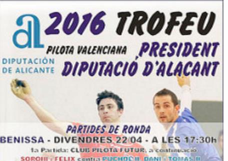 La Gran final del Trofeu President de la Diputació se celebrarà el pròxim 6 de maig, al Trinquet municipal. Serà després de la partida del Club Pilota Futur, que començarà a les 17.30 hores. La Final la jugaran els dos primers equips classificats de la ronda, que es jugarà prèviament.