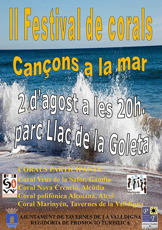 La Regidoria de Promoció Turística patrocina i promociona el festival de corals “Cançons a la mar”, amb el propòsit d’impulsar la música coral i fer més variades i atractives les activitats turístiques a la platja de Tavernes.