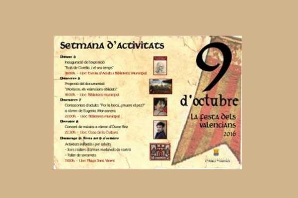 El dissabte 8 d’octubre a les 22.30 hores la Casa de la Cultura acollirà el concert de música a càrrec d’Òscar Briz i el 9 d’octubre, dia de la Comunitat Valenciana, hi haurà jocs infantils i construcció d’armes medievals de cartró i taller de socarrats per a persones adultes. Serà a les 11 hores a la plaça Sant Vicent.
