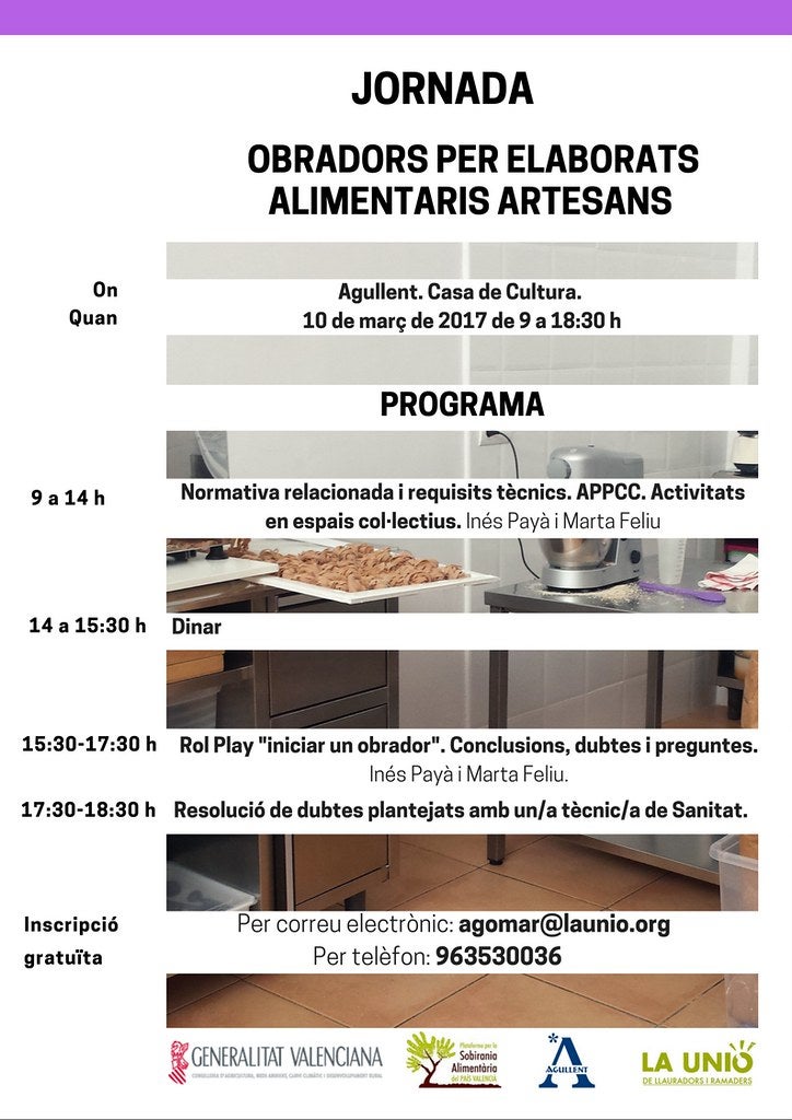 La Unió de Llauradors i Ramaders ha triat a Agullent com a seu per a una jornada formativa sobre el funcionament i normativa d’obradors per a l’elaboració artesana d’aliments. La jornada tindrà lloc el divendres 10 de març de 9 a 14 hores i de 15:30h a 18:30 hores.