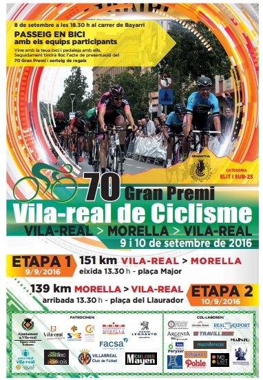 Els dies 9 i 10 de setembre es disputarà el 70è Gran Premi Vila-Real- Morella. Una clàssica que compleix set dècades i que uneix aquestes dues localitats de la província de Castelló en un gran espectacle esportiu. La primera etapa, que sol ser decisiva, arribarà al Passeig de l’Albereda de la ciutat dels Ports el divendres 9 a la vesprada. Al dia següent, la competició partirà al matí de Morella, per tancar el Gran Premi a Vila-real.
