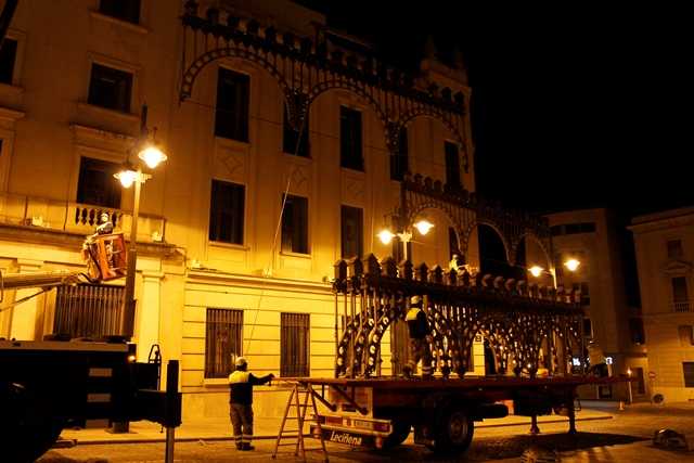 La Brigada d’Obres de l’Ajuntament d’Alcoi va començar ahir la instal·lació de l’enramada amb els 19 trams de la plaça d’Espanya. Aquest any es renovaran els escuts de les filaes i seran d’un material més lleuger.