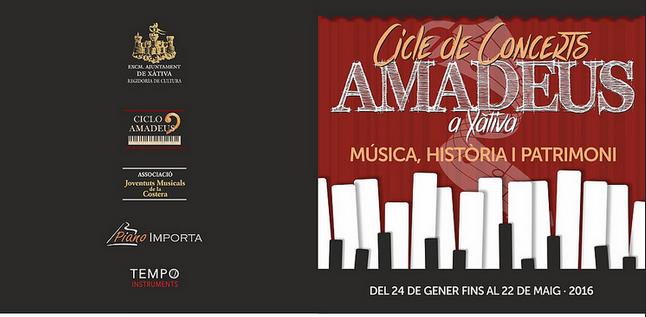 L’Ajuntament de Xàtiva ha promogut un cicle de cinc concerts de piano que tindran lloc en el marc dels principals espais patrimonials de la ciutat. El cicle de concerts Amadeus reuneix a un selecte grup de joves pianistes guardonats i becats en nombrosos concursos en Espanya, França, Itàlia, Alemanya o Regne Unit. El concerts començaran el proper diumenge 24 de gener, a les 12h, a l’església de Sant Feliu i aniran programant-se a raó d’un al mes en espais com Sant Domènec (14 de febrer, 12h), la Casa de Cultura (13 de març, 12h), el pati del Museu de l’Almodí (17 d’abril, 12h), per a finalitzar el 22 de maig a l’església de Sant Pere (18’30h).