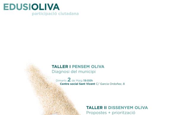 D’una altra banda es realitzaran també uns tallers participatius en 2 sessions obertes per a tothom els dies 27 d’abril i 13 de maig al centre social Sant Vicent (c/ Garcia Ordoñez, 8). El dijous 2 de maig a les 19:00 de la vesprada se celebrarà el Taller I de Diagnosi col·laborativa de la situació del municipi, on tots els assistents podran compartir la seua visió d’Oliva. El dissabte 13 de maig a les 10:00 del matí al mateix centre social Sant Vicent tindrà lloc una sessió de participació on els assistents tindran l’oportunitat de compartir les seues propostes per a millorar la ciutat i prioritzar quines de totes les propostes que sorgeixen són més urgents.