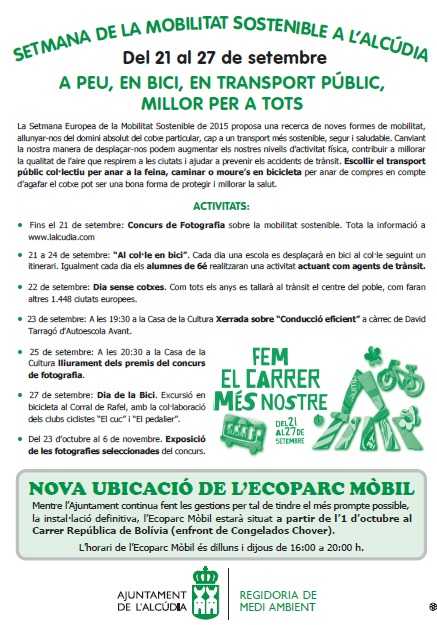 Dins de les activitats que l’ajuntament ha preparat es troba un concurs de fotografia ‘L’Alcúdia Sostenible’ amb temàtica del medi ambient i entorn urbà de la localitat, amb tres premis que es lliuraran el 25 de setembre a les 20.30 hores a la Casa de la Cultura.