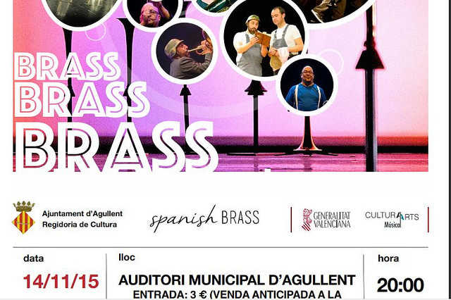 L’Auditori municipal d’Agullent acollirà aquest dissabte 14 de novembre a les 20h l’espectacle “Brass, Brass, Brass”, un concert pedagògic per a tots els públics amb un repertori musical variat, que va des del barroc fins al jazz, tot passant per la música popular de diversos països.