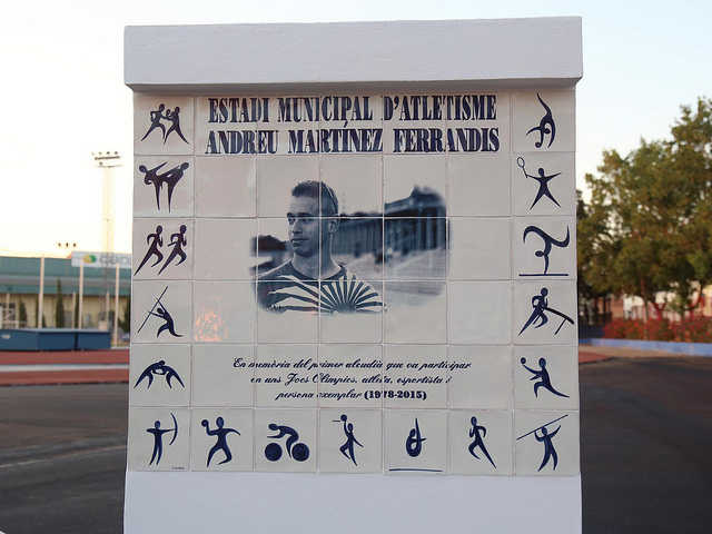 A continuació els assistents a l’homenatge es dirigiren a la pista d’atletisme on es va descobrir un monòlit amb el nom i fotografia d’Andreu Martínez Ferrandis que dona nom a l’Estadi d’Atletisme amb la inscripció “En memòria del primer alcudià que va participar en uns Jocs Olímpics, atleta, esportista i persona completa. 1978-2015”.