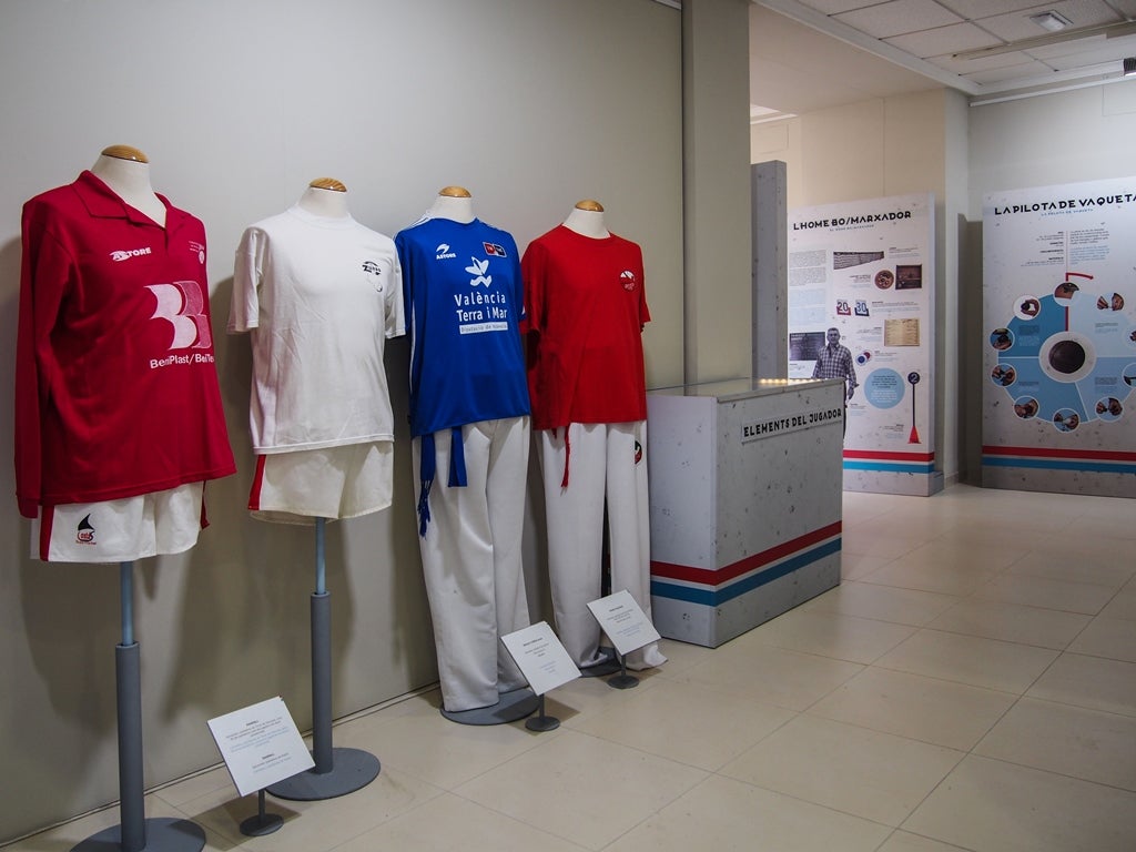 Així, es mostra la indumentària de mitjans del segle passat i l’actual, un element en el qual s’observa l’enorme avanç que ha donat la pilota en aquestes dècades. El material exposat consta de panells informatius, maquetes d’espais de joc, cartelleria, documents històrics, diferents tipus de pilotes i utillatge, així com diversos audiovisuals. L’exposició també aborda la pilota valenciana més enllà de l’àmbit estrictament esportiu, mostrant tot allò que embolica al joc, com la rellevància social dels jugadors i de les relacions entre ells, la presència i la participació del públic, les normes, les modalitats, els equipaments i la percepció que tradicionalment ha tingut la societat valenciana d’aquest esport.