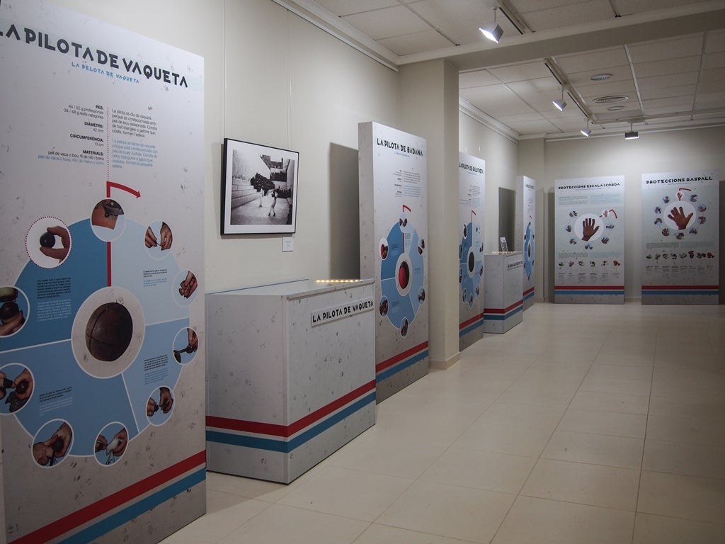 Així, es mostra la indumentària de mitjans del segle passat i l’actual, un element en el qual s’observa l’enorme avanç que ha donat la pilota en aquestes dècades. El material exposat consta de panells informatius, maquetes d’espais de joc, cartelleria, documents històrics, diferents tipus de pilotes i utillatge, així com diversos audiovisuals. L’exposició també aborda la pilota valenciana més enllà de l’àmbit estrictament esportiu, mostrant tot allò que embolica al joc, com la rellevància social dels jugadors i de les relacions entre ells, la presència i la participació del públic, les normes, les modalitats, els equipaments i la percepció que tradicionalment ha tingut la societat valenciana d’aquest esport.