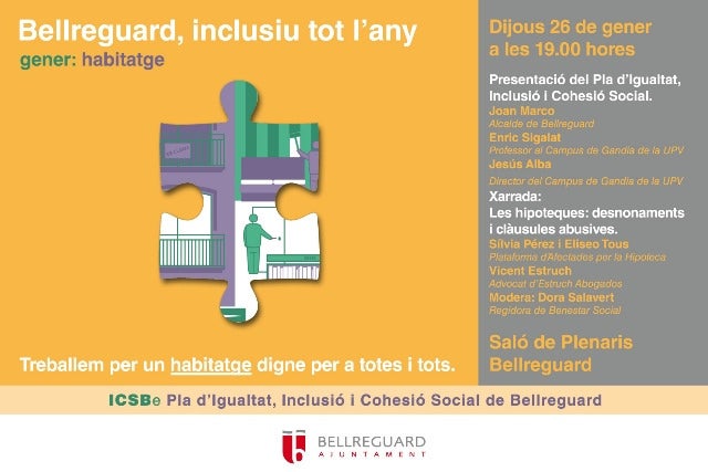 Bellreguard, inclusiu tot l’any, el pla preveu dedicar un mes a cadascuna de les àrees tractades amb el propòsit de centrar les gestions, xerrades, difusions, campanyes de conscienciació, documentals, exposicion, etc. En eixe context, en gener es parlarà d’habitatge en una taula rodona amb Silvia Pérez i Eliseo Tous, activistes de la Plataforma de Persones Afectades per la Hipoteca (PAH) que exposaran a Bellreguard la problemàtica social que representa el fet que les famílies hagen d’abandonar el seu habitatge pels impagaments dels deutes hipotecaris. Acompanyaran als representants de la PAH el conegut advocat Vicent Estruch d’Estruch Abogados, que parlarà sobre les clàusules abusives en les hipoteques. L’acte tindrà lloc