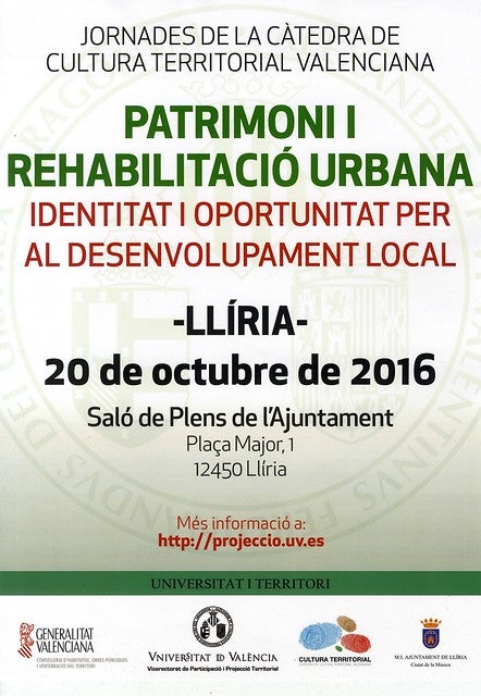 El pròxim dijous 20 d’octubre, al Saló de Plens de l’Ajuntament, es durà a terme una de les quatre jornades de la Càtedra de cultura territorial valenciana, que abordarà el tema del patrimoni i la rehabilitació urbana com a motor del desenvolupament local.