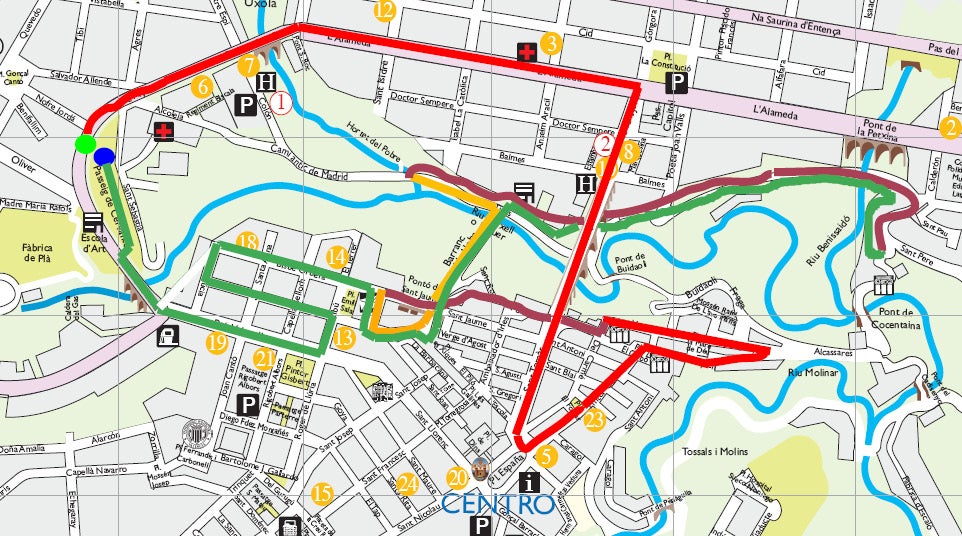 Els adults, per la seua banda, prendran l’eixida a Cervantes (a l’alçada del carrer Oliver), i des d’allà correran per Alçamora, Pont de Sant Roc, l’Alameda, Pont de Sant Jordi, Sant Tomàs, Plaça d’Espanya, Pintor Casanova (carrer Major), Placeta del Carbó, Sant Miquel, Santa Maria, Carrer del Carme, Puríssima, Sant Jaume, lateral de l’Escola d’Art, Barranc de Na Lloba, partida Tints fins al Muboma (Algessares), tornant per la vora del riu fins al carrer Barranc de Na Lloba, Bisbe Orberà, Sant Jordi, Plaça Emilio Sala, Bambú, País Valencià, Pont de Maria Cristina, i meta també al Passeig de Cervantes.