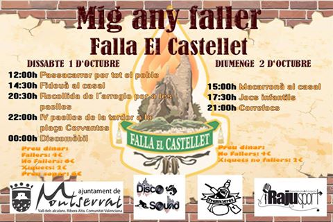 Pel que fa al diumenge 2 d’octubre, tindrem macarronà al Casal (15h), jocs infantils amb unflables de Rajusport Empresa Deportiva (17:30h) i, per acabar, despedirem el nostre ‘Mig Any Faller’ amb el Correfocs a càrrec de Tramus Coeters Montserrat (21h).