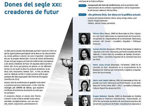 A continuació, tindrà lloc la primera conferència: «En primera línia. Ser dona en la política actual», a càrrec de Carmen Montón, Maria Josep Amigó, Maria José Català i Àngela Ballester. Modera: Jèssica Crespo, periodista.