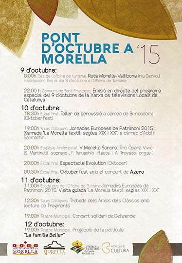 L’espectacle del 9 d’octubre serà una de les activitats importants d’aquest cap de setmana marcat per les festivitats de divendres i dilluns. Però hi ha molts més actes i els veïns, veïnes i visitants podran trobar oferta relacionada amb la cultura, gastronomia, festa, música o esport. Divendres, a més de l’esmentat espectacle, al matí s’ha organitzat la ruta senderista Morella-Vallibona. Aquesta recorre el riu Cérvol i passa per un dels paratges més bonics del terme. Per participar cal apuntar-se a l’Oficina de Turisme. Aquesta activitat està dins de les Jornades de Patrimoni Cultural Europeu, que completaran una conferència i una visita guiada per la Morella tèxtil, el dissabte i el diumenge. Dissabte també tindrà lloc una nova edició de l’Oktoberfest, amb Brincadeira i Evolution a la vesprada i l’actuació d’Azero, a la nit. A més, la música serà protagonista, amb l’últim concert del V Morella Sonora dissabte i el concert solidari Delwende diumenge. Finalment, destacar que diumenge tindrà lloc la trobada dels Amics dels Clàssics amb lectura de fragments i cinema, amb la projecció de “La família Belier”, dilluns.