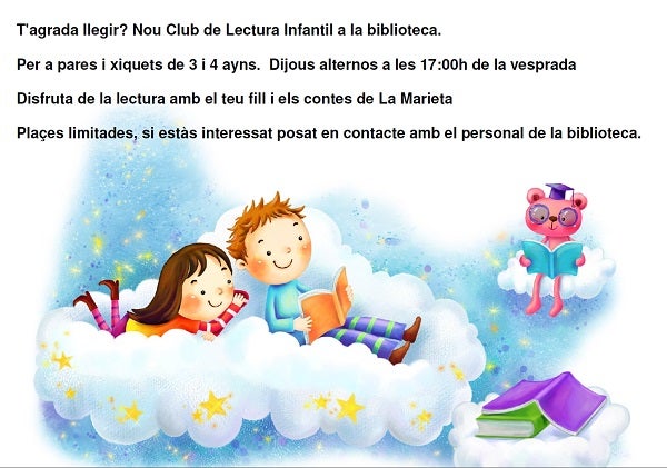 Per a formar part d’aquest club és preceptiu inscriure’s. Les lectures se celebraran els dijous alterns en la sala infantil de la biblioteca (situada en el carrer Major) a les 17 hores. Els interessats poden informar-se ja en el mostrador de la biblioteca.