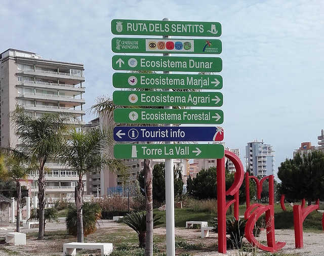 D’esta manera, s’han disposat els senyals en punts estratègics, com les rotondes i els encreuaments, que informen de quins són els servicis que ofereix la platja i el poble, així com les indicacions per a seguir la Ruta dels Sentits, la Ruta de la Cova del Bolomor, la Tourist Info o la torre de guaita La Vall, i els ecosistemes.