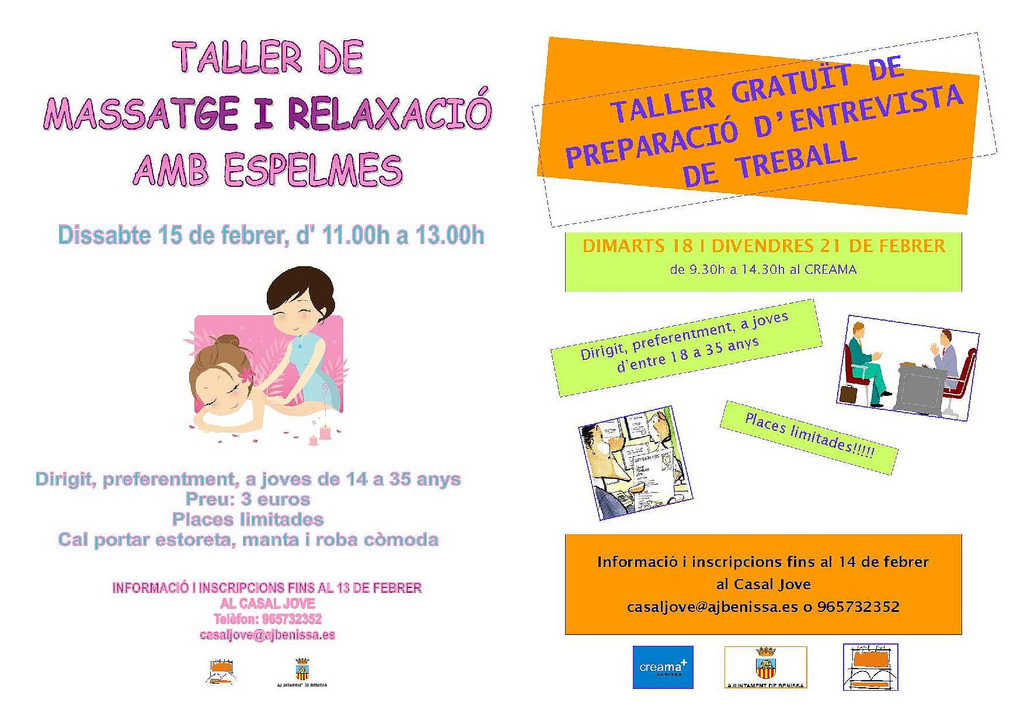 Com ja va avançar en roda de premsa, el regidor de Joventut de l’Ajuntament de Benissa, Jorge Ivars, durant el mes de febrer, a més de les activitats permanents que es realitzen en el Casal Jove, el pròxim mes, es realitzaran dues noves activitats. Aquestes són, el taller de massatge i relaxació, i el taller de preparació d’entrevista de treball.