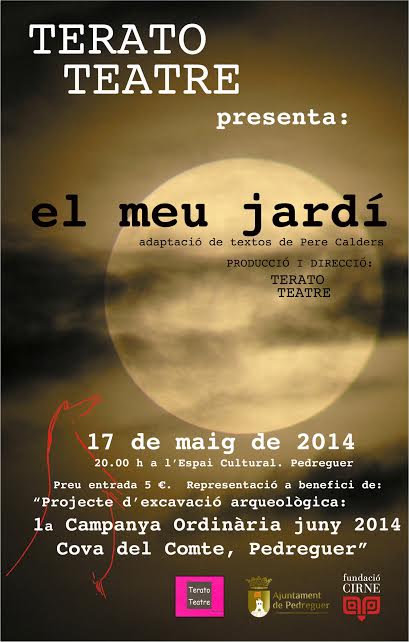 .El grup de teatre Terato Teatre ha volgut col·laborar amb el finançament de la “Primera Campanya Ordinària juny 2014 Cova del Comte, Pedreguer” i ha decidit representar el proper 17 de maig, a l’Espai Cultural de Pedreguer, a les 20,00 hores, l’obra El meu jardí, una adaptació sobre textos de Pere Calders.
