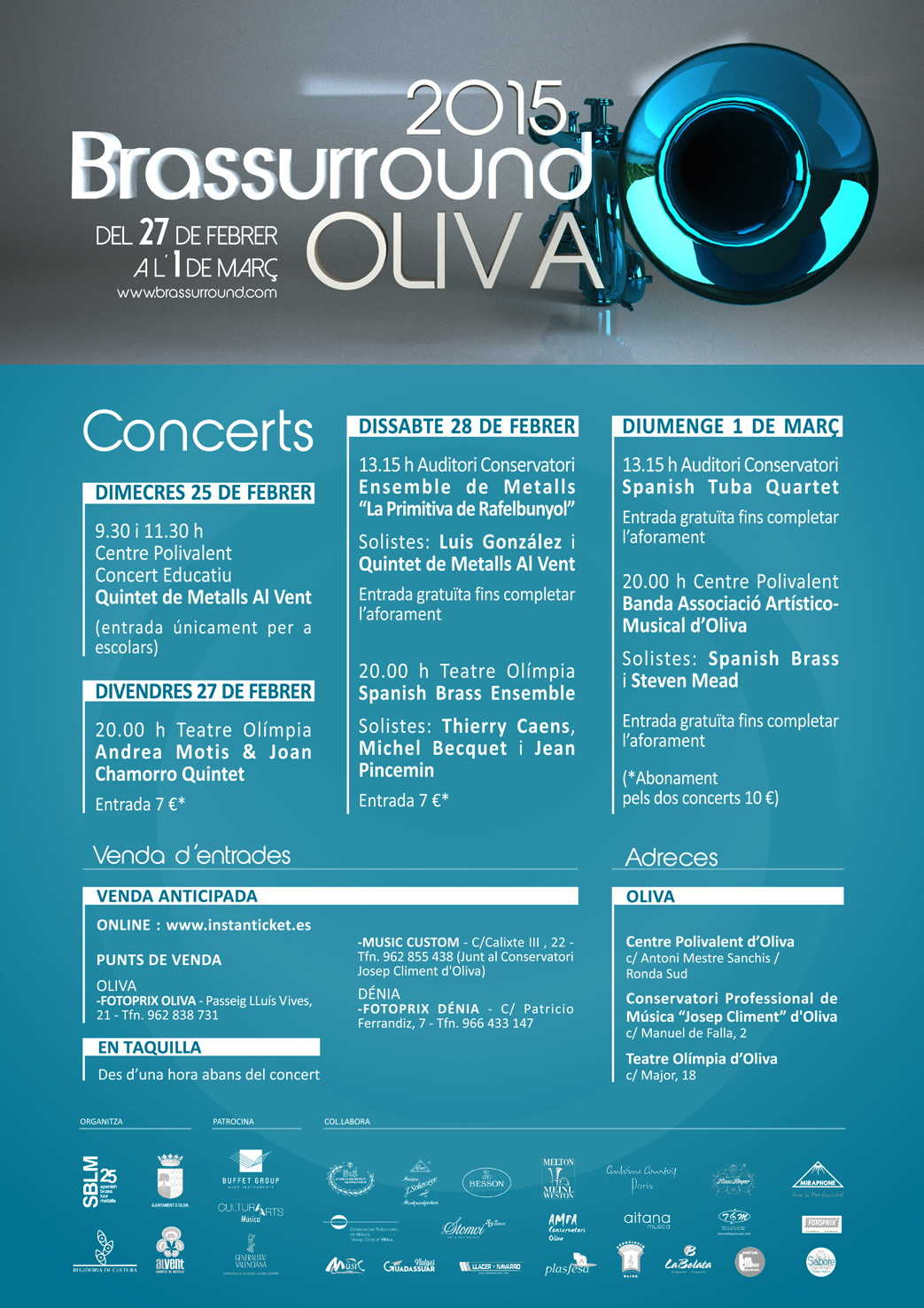 El festival festival Brassurround Oliva 2015 està organitzat per la regidoria de Cultura de l’Ajuntament d’Oliva, Spanish Brass Luur Metalls i el Quintet de Metalls Al Vent, amb la col•laboració del Conservatori Professional de Música Josep Climent, lloc on s’hi desenvoluparà una part, l’AMPA del centre o l’Associació Artístico-Musical d’Oliva.