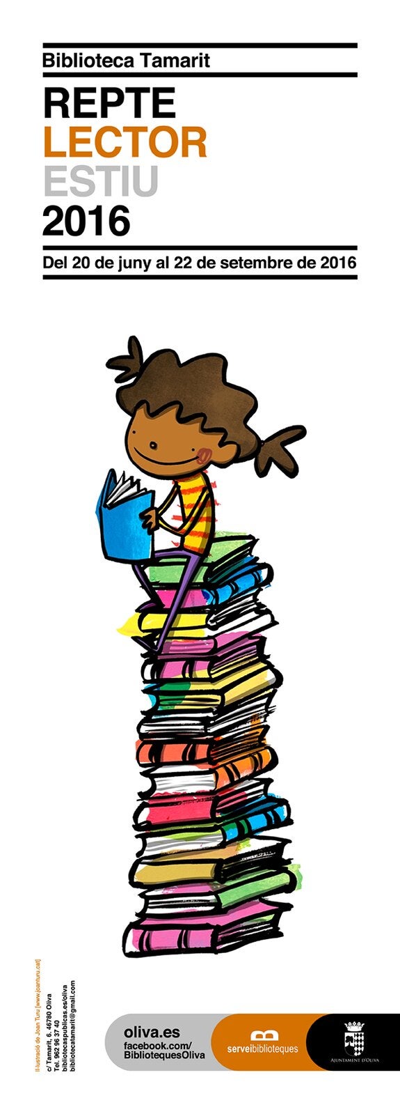 Vist l’èxit i la participació del Repte Lector Estiu 2015, el Servei de Biblioteques ha programat la segona edició, del 20 de juny fins al 22 de setembre. L’activitat, que es desenvoluparà a la Biblioteca Tamarit, està indicada per a xiquetes i xiquets de 6 a 16 anys. La Biblioteca proposa quatre nivells diferents, quatre reptes, i estableix una llista amb diversos ítems, que inclou llibres de diferents gèneres literaris, diferents temàtiques, autors, etc. Amb açò es pretén oferir una àmplia gamma de lectures on poder triar, i alhora incloure ítems per a conduir els participants cap a lectures menys conegudes, menys comercials, però que poden ser de major qualitat literària, obrir-los les portes a noves experiències lectores.